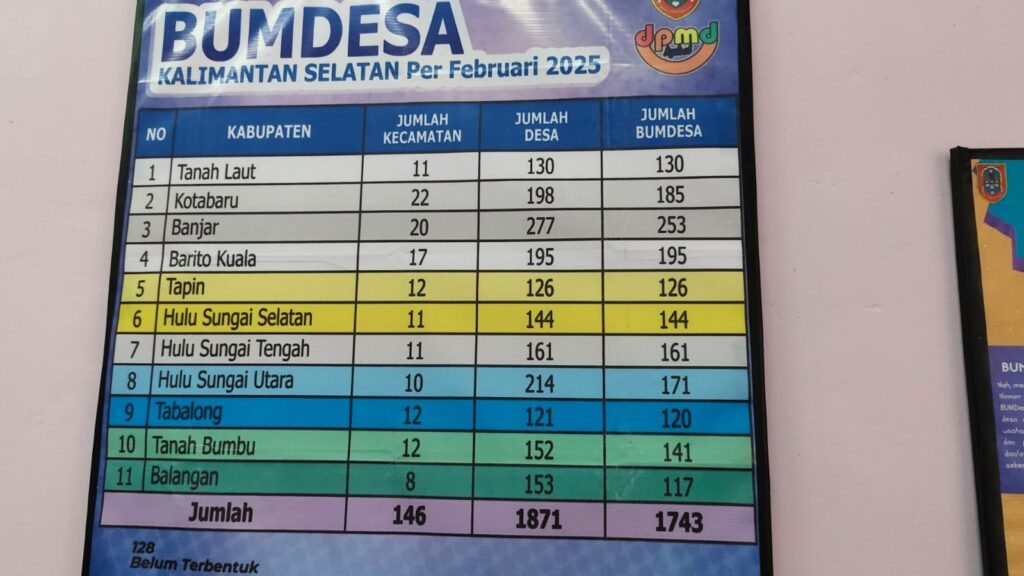 Berdasarkan data Dinas Pemberdayaan Masyarakat dan Desa (PMD) Provinsi Kalimantan Selatan, hingga Februari 2025 tercatat sebanyak 1.743 BUMDesa telah terbentuk dari total 1.871 desa yang tersebar di 146 kecamatan pada 11 kabupaten/kota. Dengan demikian, masih terdapat 128 desa yang belum memiliki BUMDesa.