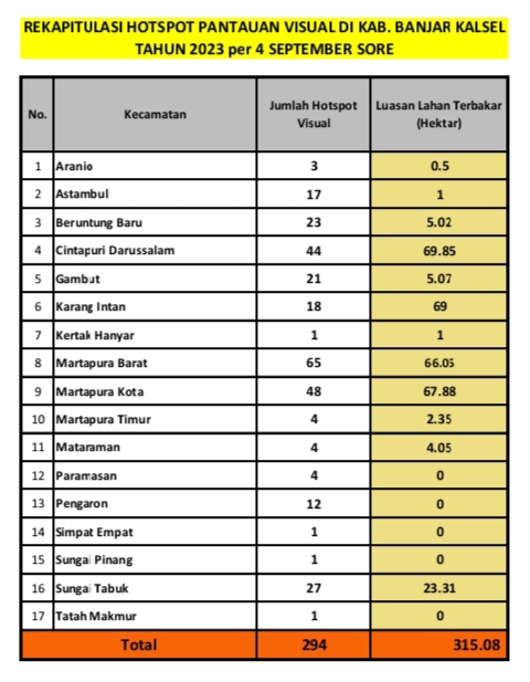sementara itu warsita menambahkan dari data dilapangan titik hotspot yang terpantau terbanyak di wilayah kecamatan martapura barat sebanyak 65 titik api dan disusul oleh martapura timur dan kecamatan cintapuri, ini telah menjadi fokus BPBD Banjar agar titip hotspot tidak bertambah disetiap wilayah. berikut data hotspot di wilayah kabupaten banjar :