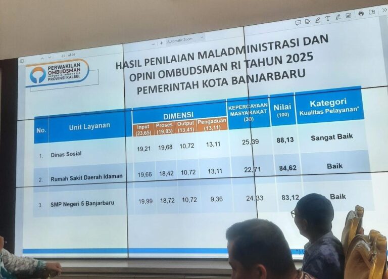 PESISIR MEDIA.COM – BANJARBARU – Dinas Sosial (Dinsos) Kota Banjarbaru meraih penghargaan dari Ombudsman Republik Indonesia dalam penilaian maladministrasi pelayanan publik tahun 2025. Dalam penilaian tersebut, Dinsos Banjarbaru memperoleh nilai kualitas pelayanan dengan predikat Sangat Baik.