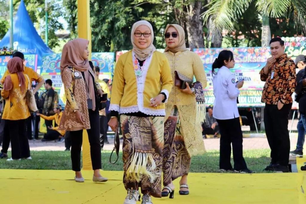Kepala Dinas Kehutanan Provinsi Kalimantan Selatan, Fathimatuzzahra hadir dalam acara Puncak Hari Jadi Provinsi Kalimantan Selatan tersebut dengan balutan busana kuning aksesoris bunga khas adat banjar.