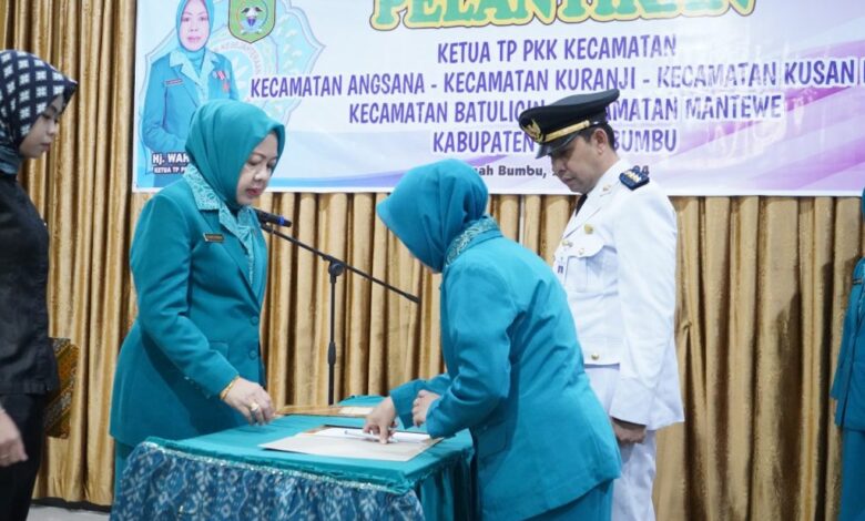 PESISIR MEDIA.COM BATULICIN – Ketua TP PKK Kabupaten Tanah Bumbu, Hj Wahyu Windarti Zairullah melantik Lima Ketua TP PKK Kecamatan.