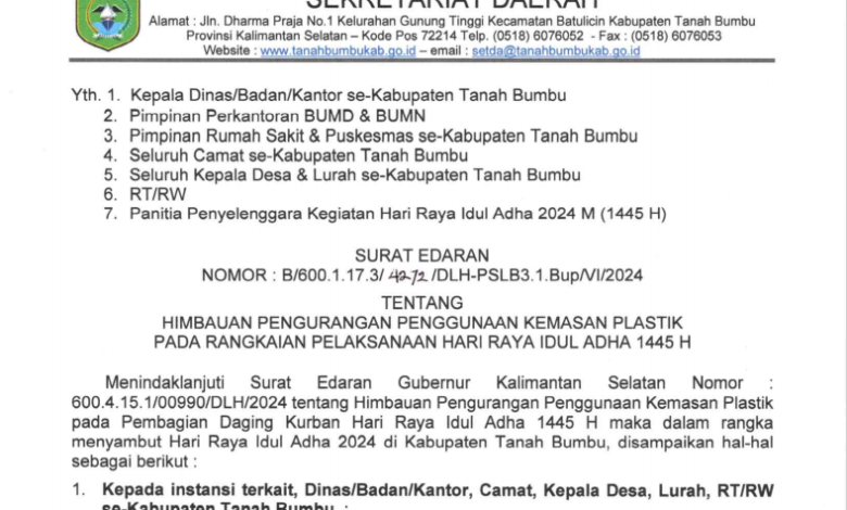 PESISIR MEDIA COM, BATULICIN –Pada Hari Raya Idul Adha 1445 H, Pemerintah Kabupaten Tanah Bumbu (Pemkab Tanbu) melalui Dinas Lingkungan Hidup (DLH) mengeluarkan surat edaran imbauan pengurangan penggunaan kemasan/kantong plastik untuk kurban idul adha.Dalam Surat Edaran Nomor : B/600.1.17.3/4272/DLH/PSLB3.1.Bup/VI/2024 tersebut imbauan di tujukan kepada Dinas/Badan/Kantor se-Kabupaten Tanah Bumbu. BUMD, BUMN, Rumah Sakit, Puskesmas, Camat, Kepala Desa, Lurah, RT/RW, dan Panitia Penyelenggara Kegiatan Hari Raya Idul Adha.Kepala DLH Tanbu, Rahmat Prapto Udoyo.