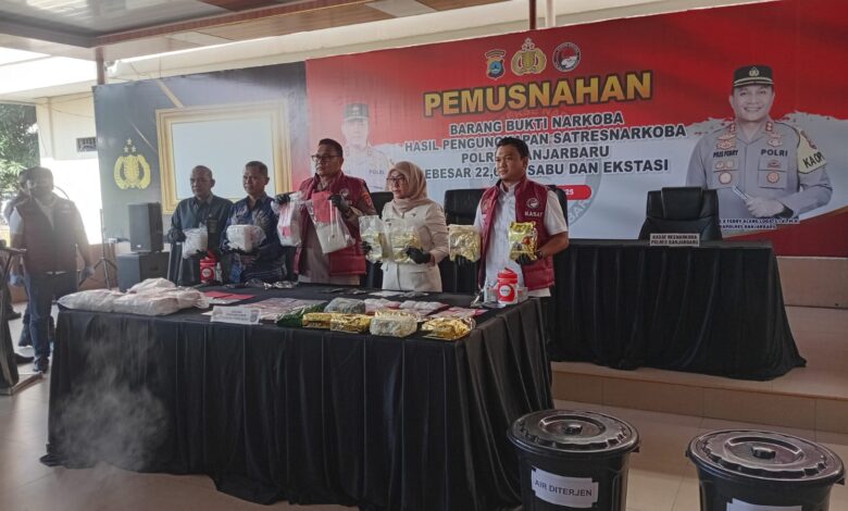 PESISIR MEDIA.COM – BANJARBARU – Jajaran Kepolisian Resor Banjarbaru memusnahkan barang bukti narkotika berupa 22,6 kilogram sabu dan 49 butir ekstasi di Aula Joglo Mapolres Banjarbaru, Selasa, (22/7/2025).