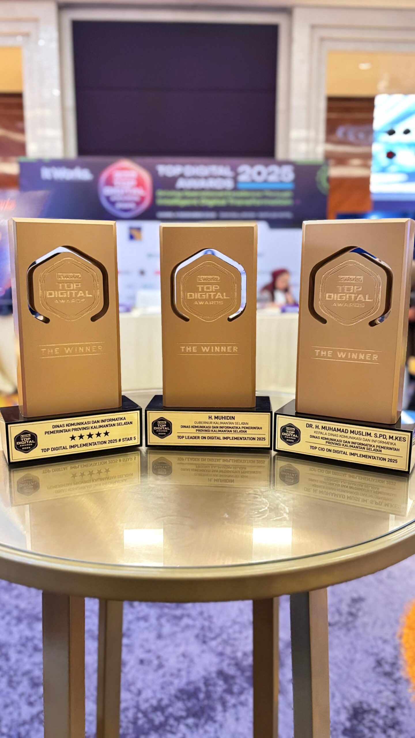 Atas keberhasilan tersebut, Gubernur Kalimantan Selatan H. Muhidin menerima penghargaan “TOP Leader On Digital Implementation 2025” sebagai bentuk apresiasi atas komitmen dan dukungannya dalam mempercepat transformasi digital di pemerintahan. Penghargaan juga diberikan kepada Kepala Dinas Kominfo Provinsi Kalsel, Dr. H. Muhamad Muslim, S.Pd, M.Kes, yang dinobatkan sebagai “Top CIO On Digital Implementation 2025” berkat konsistensi dan inovasinya dalam pengembangan sistem layanan digital di Kalsel.