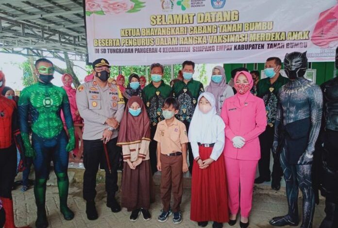 PESISIRMEDIA.COM, TANAH BUMBU – Guna menarik minat anak-anak agar mau di Vaksin Covid-19, Polres Tanah Bumbu menghadirkan sejumlah badut anak. Tujuannya, agar anak senang dan tidak takut saat melihat jarum suntikan.