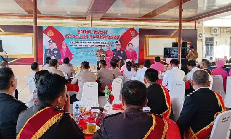Banjarbaru, Pesisir.com – Pucuk pimpinan di Kepolisian Resort Banjarbaru. AKBP Dody Harza Kusumah resmi menyerahkan jabatan Kapolres Banjarbaru kepada AKBP Pius X Febry Aceng Loda. Acara serah terima jabatan ini berlangsung khidmat di Joglo Mapolres Banjarbaru dan dihadiri oleh sejumlah pejabat utama, anggota Bhayangkari, serta awak media.